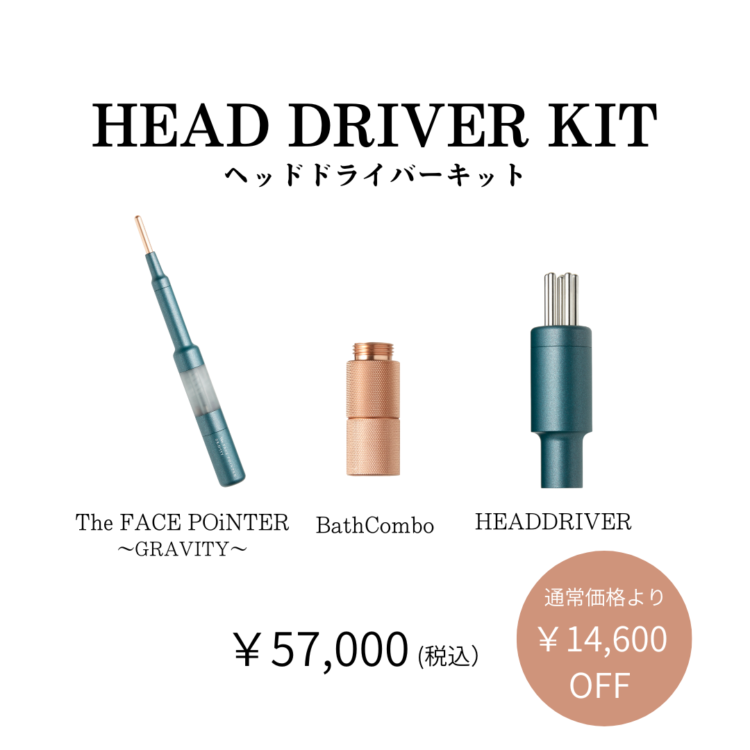 HEAD DRIVER KITは、顔の“点ケア”に特化したThe FACE POiNTERと、後頭部・首肩・咬筋など大きい筋肉を面でほぐすHEAD DRIVER、そして装着アクセサリのBath Comboをひとつにまとめた基本セットです。